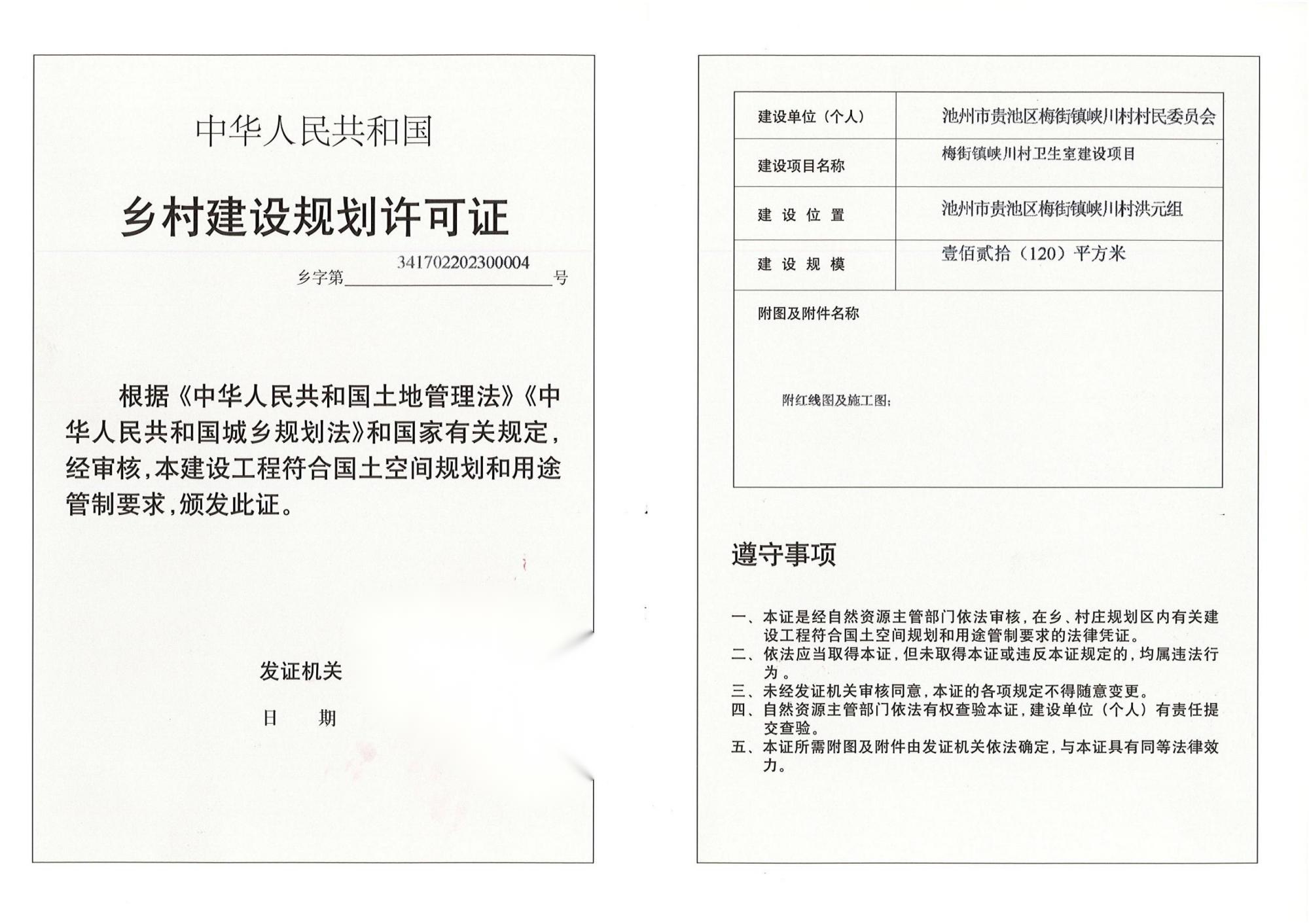 乡村建设规划许可证(梅街镇峡川村卫生室建设项目)